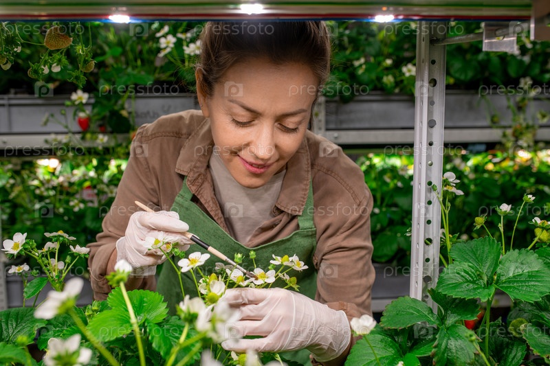 Человек в перчатках, склоняющийся над клубничными саженцами в теплице