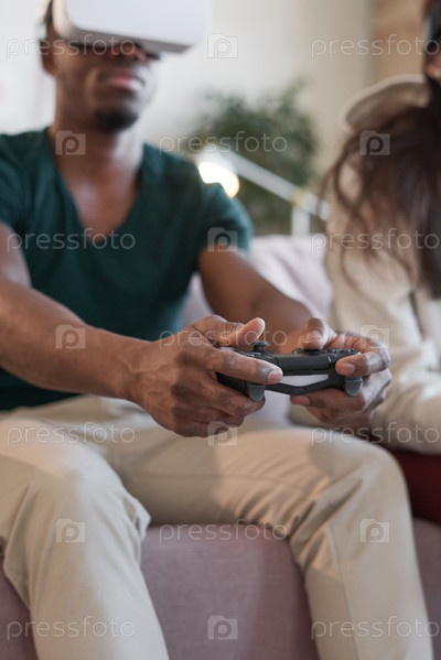 Мужчина с современными очками VR сидит на диване