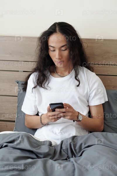 Молодой вьетнамский мужчина сидит в постели
