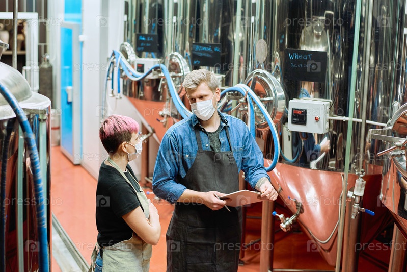 Два молодых пивовара завода по производству пива консультируются о рабочих моментах