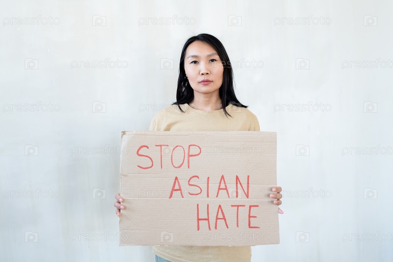 Азиатская женщина держит плакат, объявляющий о протесте против национальной дискриминации