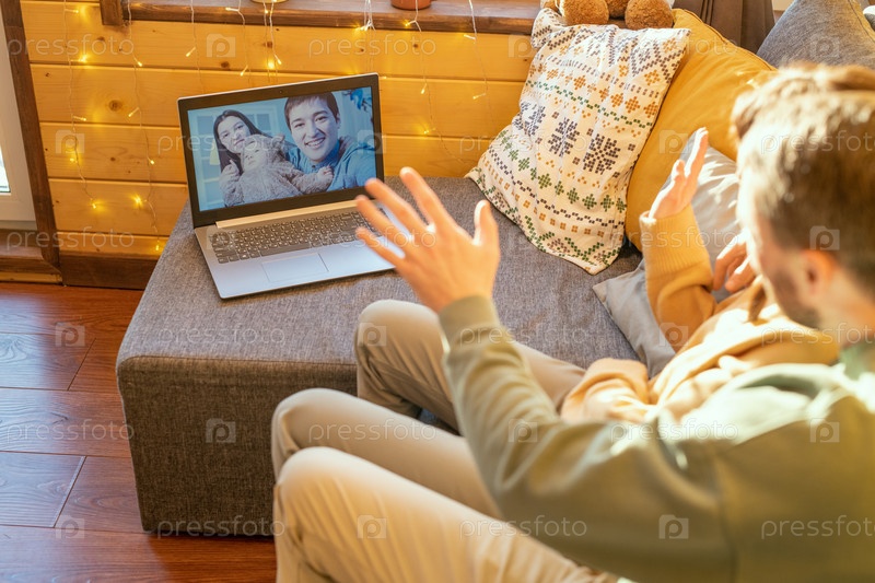 Счастливая молодая любящая пара в повседневной одежде машет руками семье из трех человек