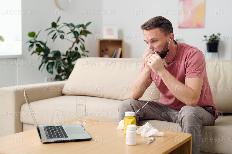 Молодой больной пациент в наушниках, дующий нос во время разговора с онлайн-врачом