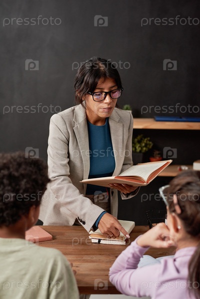 Серьезный молодой учитель смешанной расы, держащий открытый учебник и объясняющий новую тему детям в классе