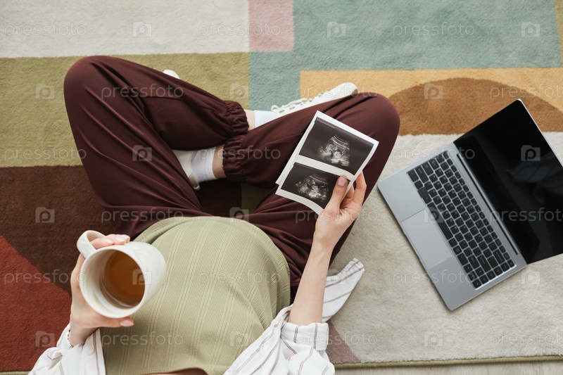 Беременная женщина с чашкой кофе на диване