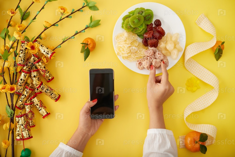 Женщина, отправляющая сообщения на китайский Новый год