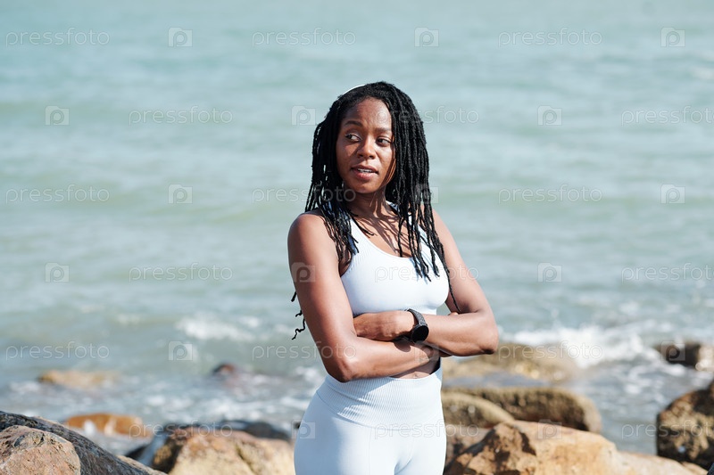 Спортсменка, стоящая на скалистом пляже