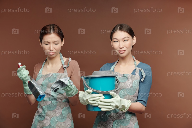 Молодые азиатские близнецы собираются убирать пол и стирать пыль с мебели