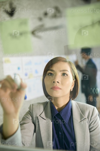 Бизнес-леди пишет на стеклянной стене