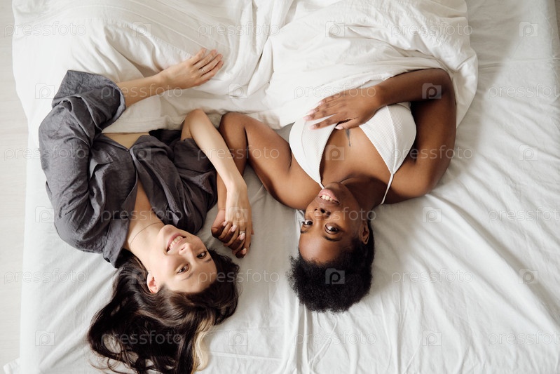 Многорасовая лесбийская пара, лежащая под одеялом