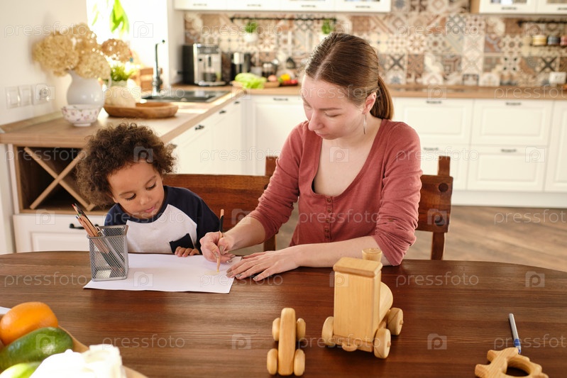 Молодая женщина рисует что-то на листе бумаги, пока учит своего маленького сына