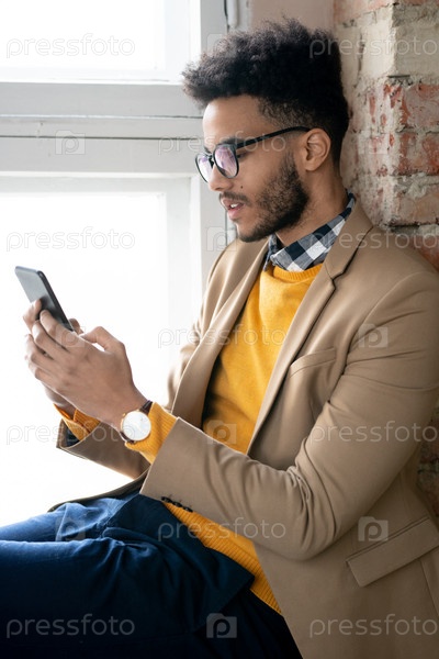 Бородатый мужчина отправляет смс-сообщение по телефону