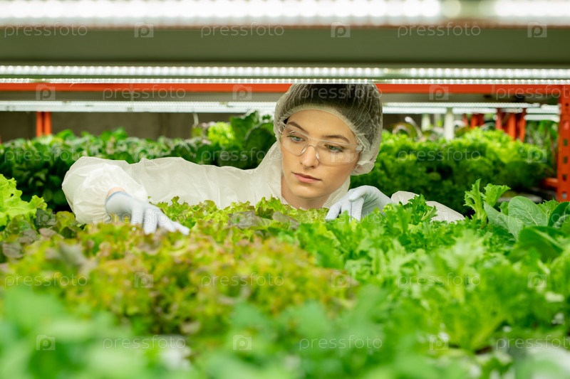 Молодая женщина-агроинженер в защитной рабочей одежде касается саженцев салата
