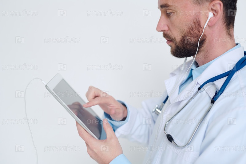 Врач в наушниках, указывающий на цифровой планшет во время приема пациентов онлайн
