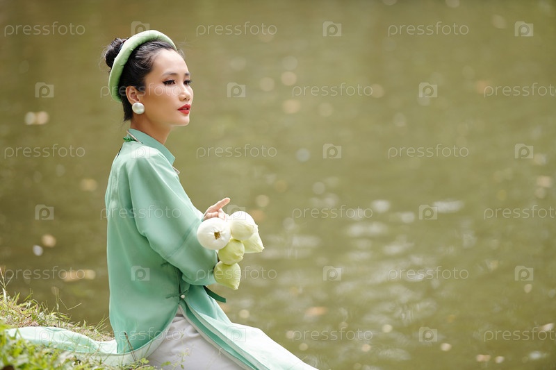 Вдумчивая женщина, отдыхающая у реки