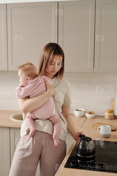 Молодая мать с очаровательной дочерью стоит у электрической плиты