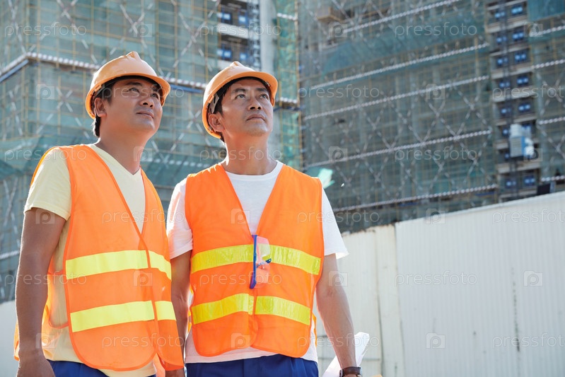 Команда строителей в оранжевых жилетах