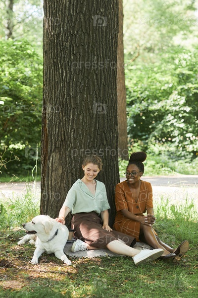 Молодые женщины в парке с двумя собаками