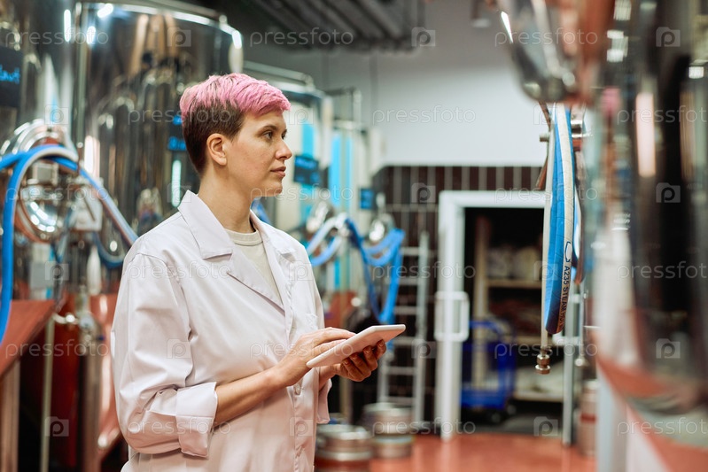 Молодая экспертница пивоварни в белом халате, вводящая данные на планшет во время просмотра нового оборудования
