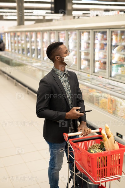 Молодой бизнесмен в защитной маске стоит на большом дисплее с замороженной пищей