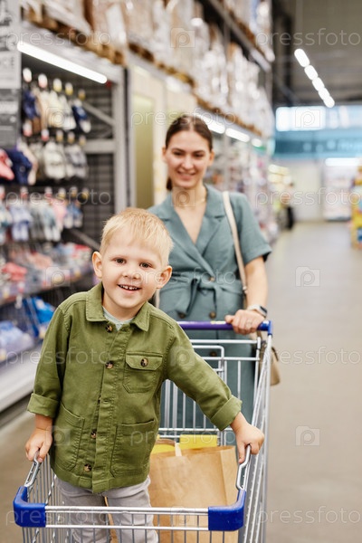 Сын толкает корзину с покупками