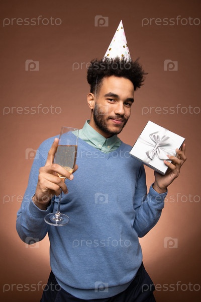 Молодой улыбающийся мужчина смешанной расы, держащий флейту из пенящего шампанского и коробки с подарками