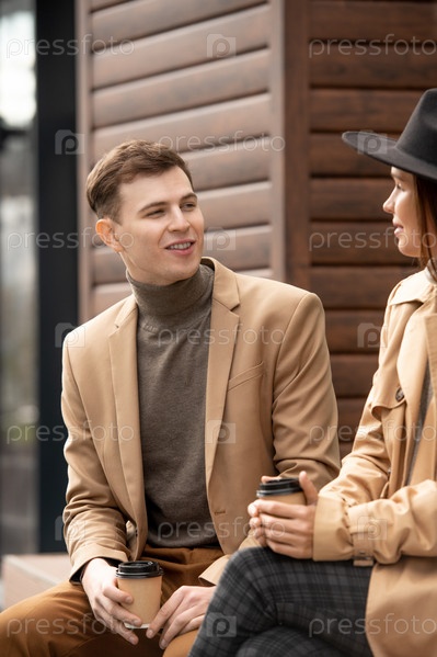 Молодой расслабленный мужчина с выпивкой смотрит на свою девушку, разговаривая с ней