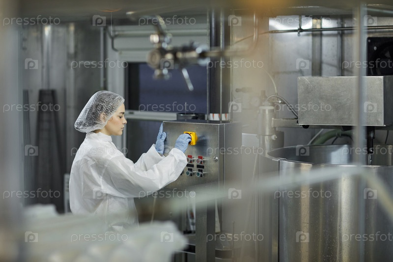 Женщина, работающая с машиной на пищевой фабрике