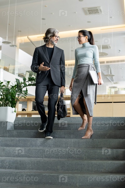 Молодая азиатская бизнесвумен с сложенным ноутбуком слушает зрелого коллегу