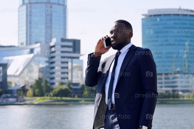 Молодой серьезный агент-мужчина в костюме консультирует клиента по мобильному телефону, стоя напротив cityscape