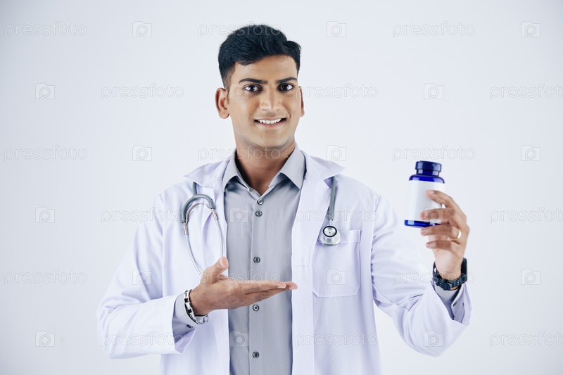 Практикующий врач с бутылкой таблеток