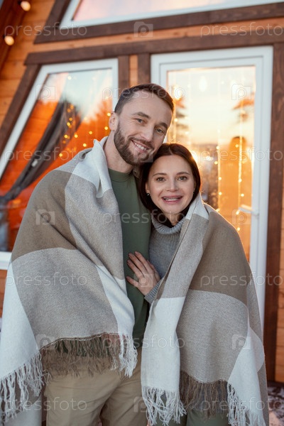 Молодая любящая пара, завернутая в колодные одежды, стоит у окна загородного дома