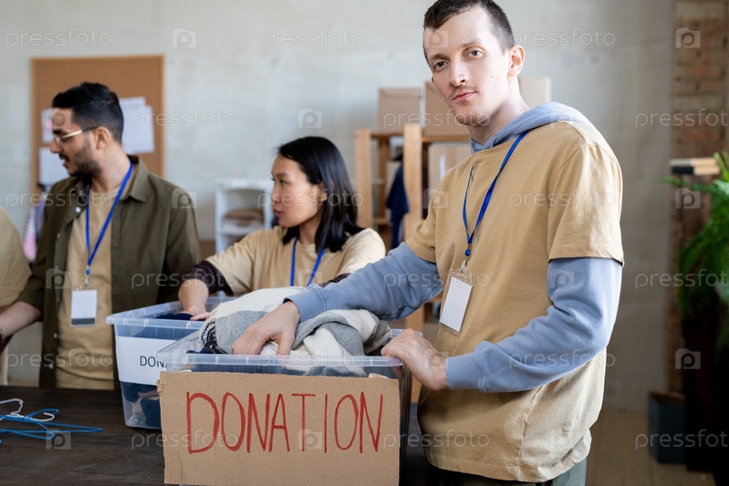 Несколько добровольцев готовят коробки с одеждой для пожертвований