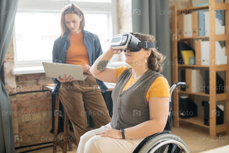 Disable женщина в VR гарнитуре сидит на инвалидной коляске и смотрит презентацию