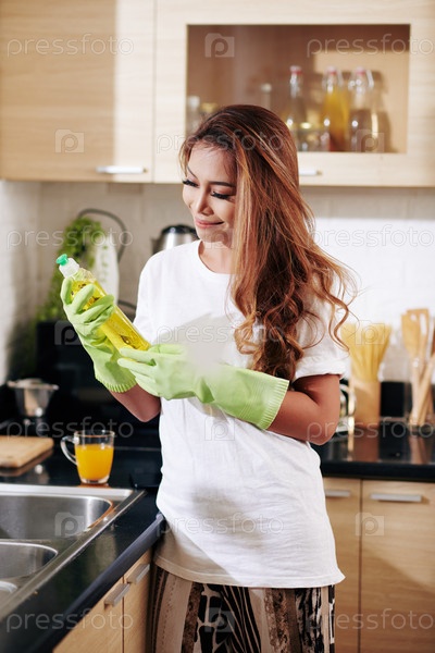 Женщина, держащая моющее средство или мыло для посуды