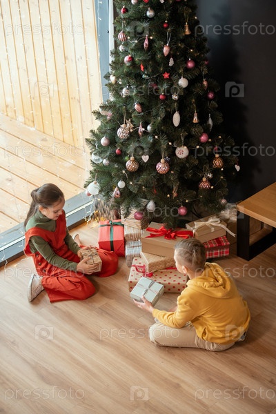 Братья и сестры сидят с подарками у рождественской елки