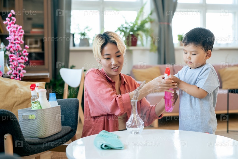 Милый мальчик и молодая азиатская женщина распыляют дезинфицирующее средство на пылесос