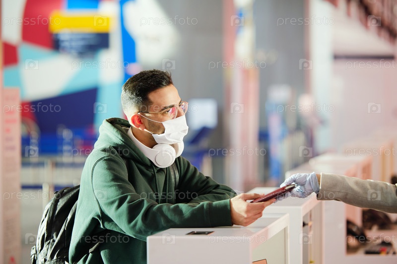 Молодой человек в повседневной одежде и защитной маске возвращает свой паспорт после регистрации