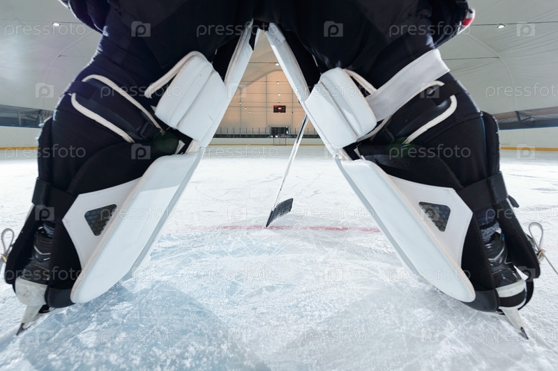 Обратный вид ног хоккеиста в коньках, стоящего на катке и держащего палку