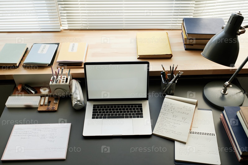 Высший вид студенческого стола с открытым ноутбуком, эскизными блокнотами, канцелярским инвентарем, лампой и книгами на подоконнике