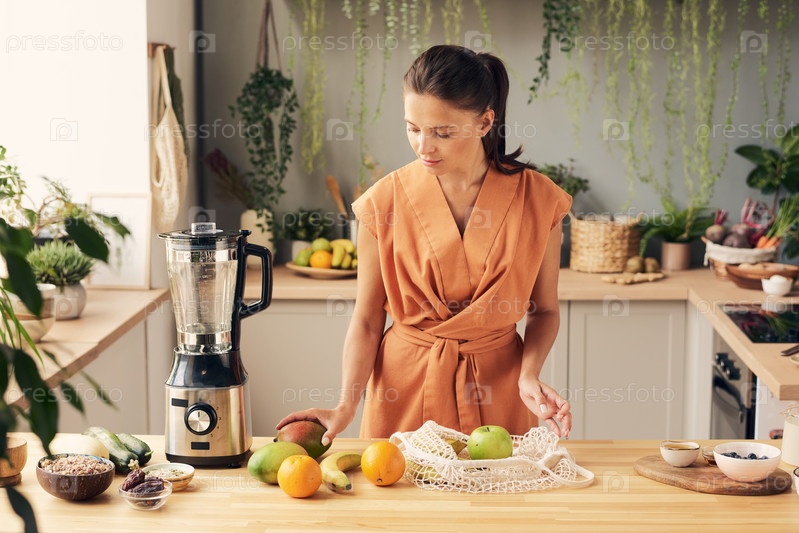 Молодая домохозяйка готовит свежие фрукты для смузи