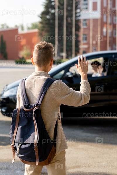 Задний вид школьника с рюкзаком, размахивающего рукой своему родителю
