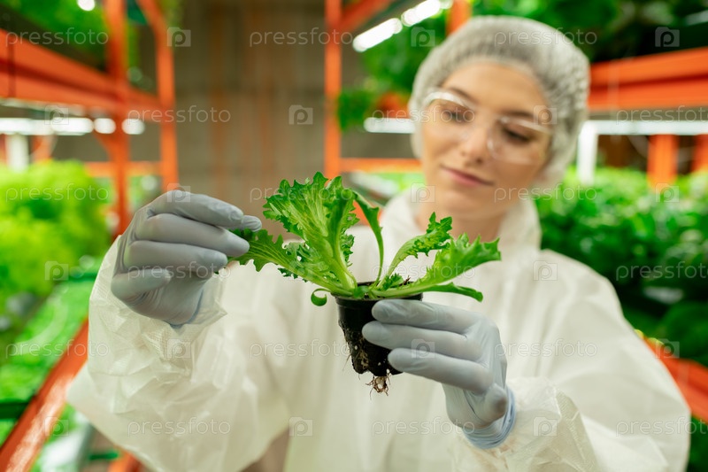 Работник теплицы проверяет листья ругулы