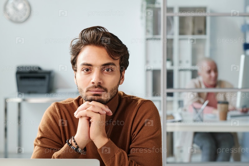 Портрет серьезного, красивого молодого офисного менеджера с Ближнего Востока в коричневом турнелеке, сидящего со зажатыми руками в кабинете