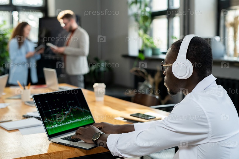 Африканский экономист-мужчина в наушниках, используя ноутбук