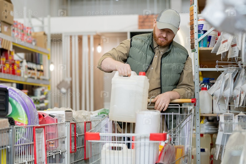 Бородатый клиент кладет бытовые товары в корзину