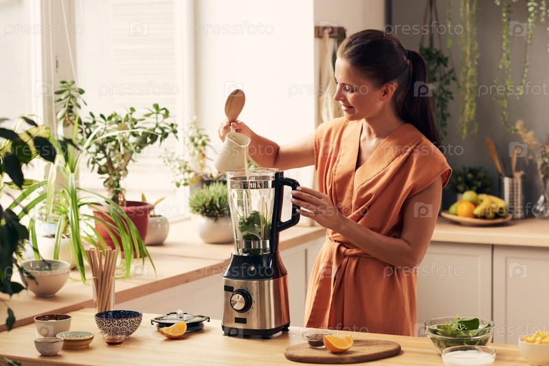 Счастливая молодая домохозяйка наливает молоко в электрический блендер