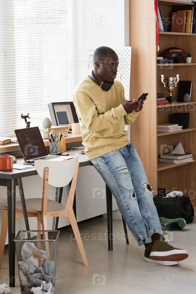 Серьезный афроамериканский студенческий мальчик с наушниками вокруг шеи, опирающийся на стол и отправляющий смс-сообщения со смартфона