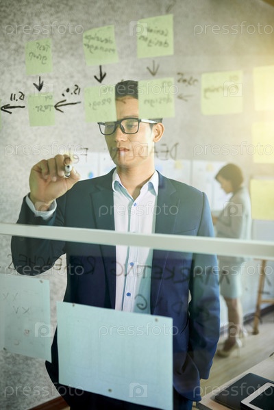 Предприниматель пишет на стеклянной стене