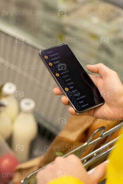 Рука человека со смартфоном, прокручивающий список вещей для покупки в корзине